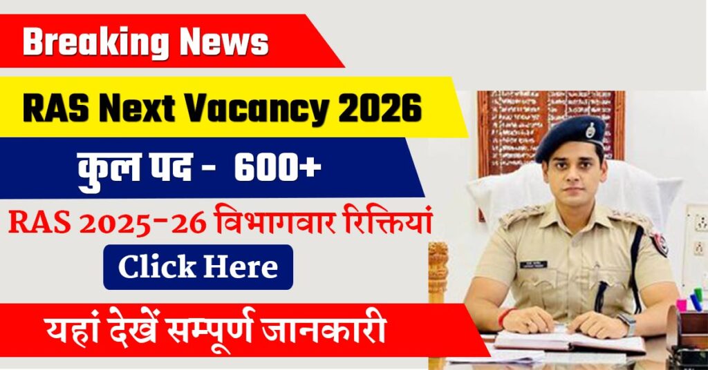 राजस्थान लोक सेवा आयोग द्वारा RAS Next Vacancy 2026 के आयोजन के लिए नया अपडेट जल्द जारी करने की घोषणा की है। आरपीएससी द्वारा आरएएस भर्ती 2026 लगभग 600+ पदों पर आयोजित करवाई जानी है। हालांकि इन पदों में बढ़ोतरी की जाने की उम्मीद जताई जा रही है। लोक सेवा आयोग द्वारा आरएएस 2026 नोटिफिकेशन कब जारी होगा व ऑनलाइन आवेदन प्रक्रिया कब तक शुरू की जाएगी इन सभी की जानकारी नीचे इस आर्टिकल में दी गई है।